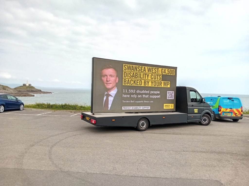 His social media posts were filled with comments from members of the public demanding answers. Amnesty International even paid for a moving billboard to drive along Swansea seafront with a picture of Bell and the caption: Swansea West: £4,500 disability cuts backed by your MP (Pictured, below).